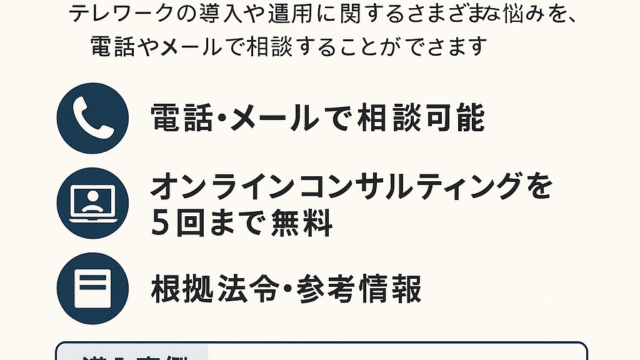 労務管理 【ブログ記事】テレワーク相談センターのご案内|無料で専門家に相談できます 2025年10月6日 hiraokatakuya https://smile-office-sr.com/wp-content/uploads/2025/03/hiraoka_rogo-02.png ひらおか社会保険労務士事務所
