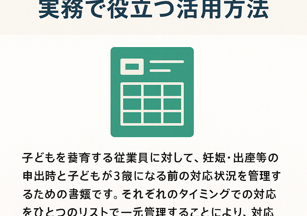 - 「個別対応管理表(育児)」は、従業員の妊娠・出産時から子どもが3歳になるまでの対応を一元化できる便利なツール。