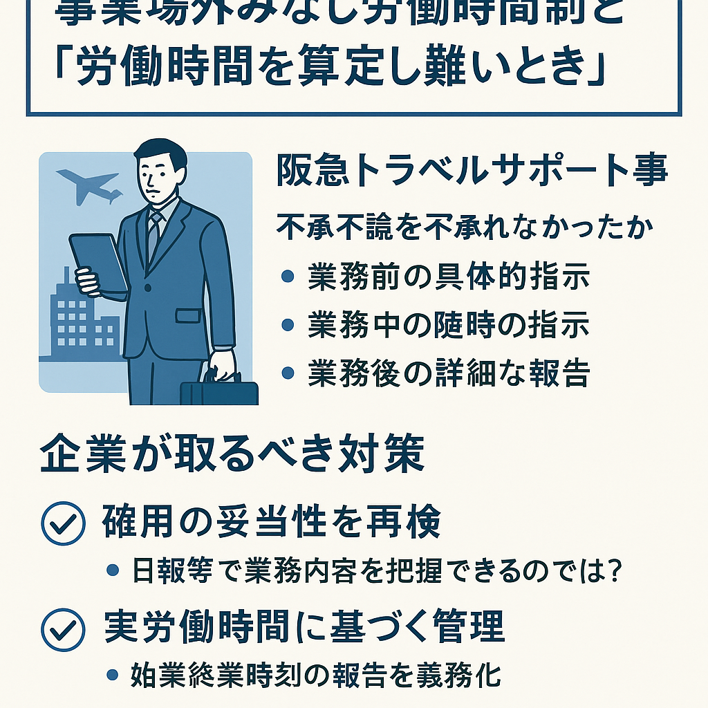 労務管理 【判例解説】事業場外みなし労働時間制と「労働時間を算定し難いとき」―阪急トラベルサポート事件から学ぶ実務対応 2025年10月3日 hiraokatakuya https://smile-office-sr.com/wp-content/uploads/2025/03/hiraoka_rogo-02.png ひらおか社会保険労務士事務所